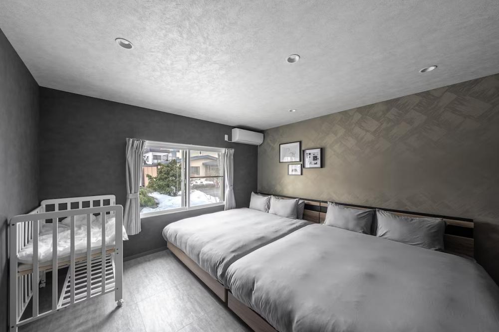 ベッドルーム1:クイーンベッド2台、ベビーベッド1台(1F・冷暖房エアコン)