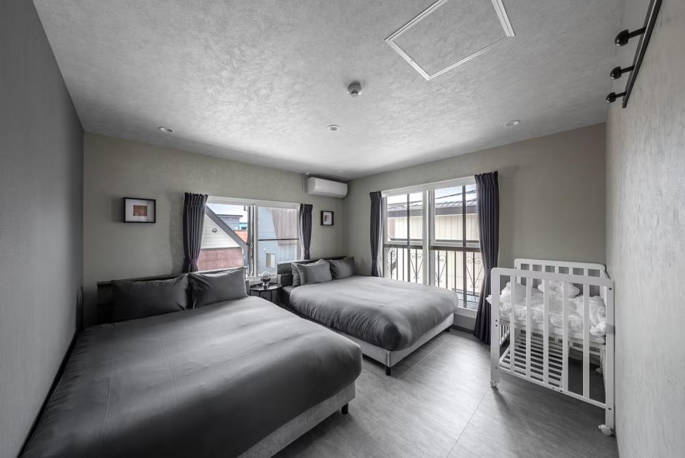 ベッドルーム1:クイーンベッド2台、ベビーベッド1台(1F・冷暖房エアコン)